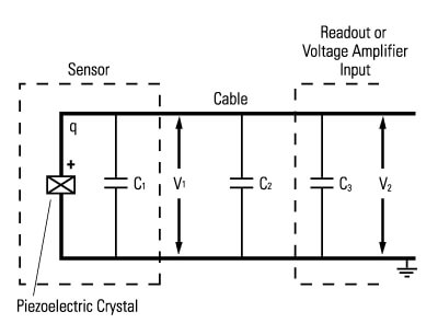 這些電壓模式系統的示意圖包括傳感器,電纜和電壓放大器或讀出設備的輸入電容,如圖2所示。絕緣電阻(信號和地之間的電阻)假設很大(> 10 12歐姆)和因此未在原理圖中示出。