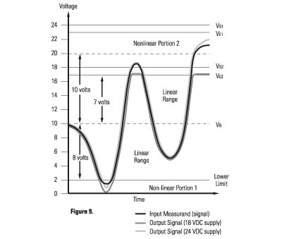 所有標準ICP®傳感器和放大器的額定激勵電壓通常在18至30伏的范圍內。該范圍的影響如圖9所示。