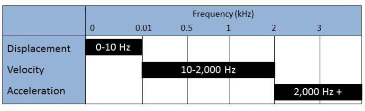 ***合適的測量單位通常取決于振動的頻率。由慢速工業機械產生的低頻振動在加速度方面僅產生少量振動,在速度方面產生適度振動,但由于其低速振動而在位移方面產生大幅振動。相反,高頻振動在位移方面僅產生少量振動,在速度方面產生適度振動,但由于其高速振動而在加速方面產生大幅振動。有關何時應以加速度,速度或位移測量振動的指導,請參見上圖。